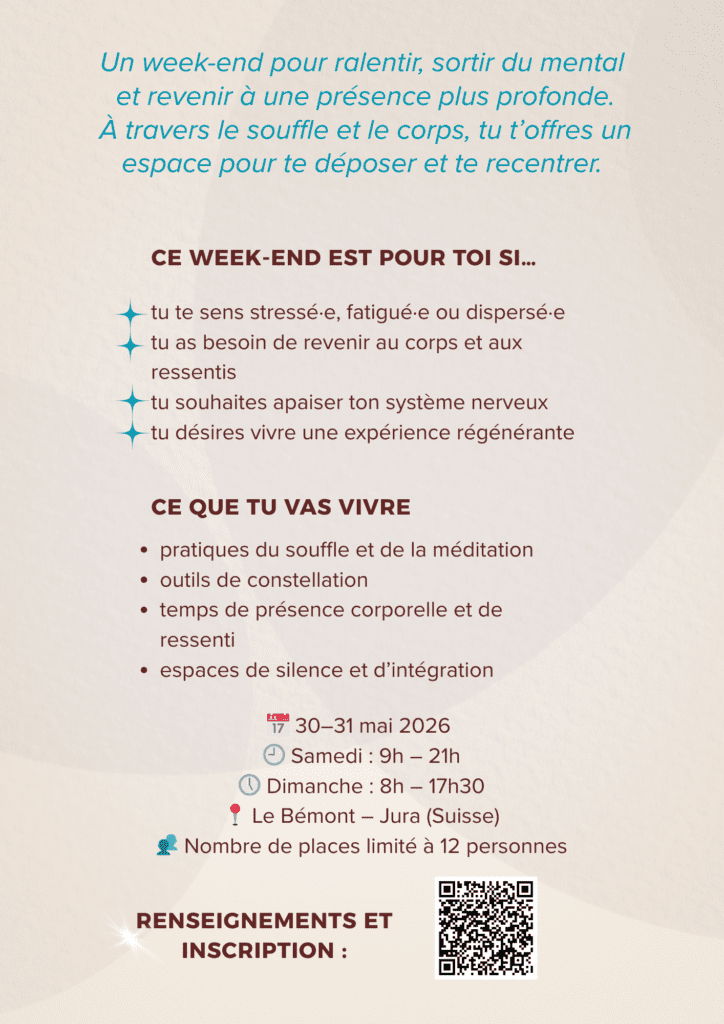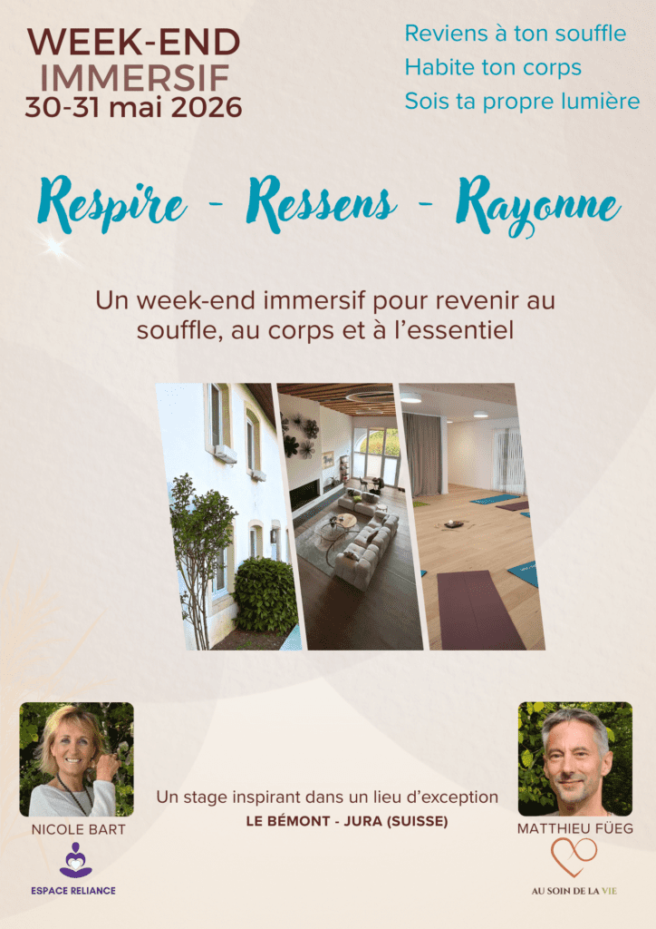 Nous nous réjouissons de vivre en ta présence ce temps fort qui amènera à retrouver la puissance de ton silence intérieur et être pleinement au cœur de ce magnifique temple qu’est le corps.